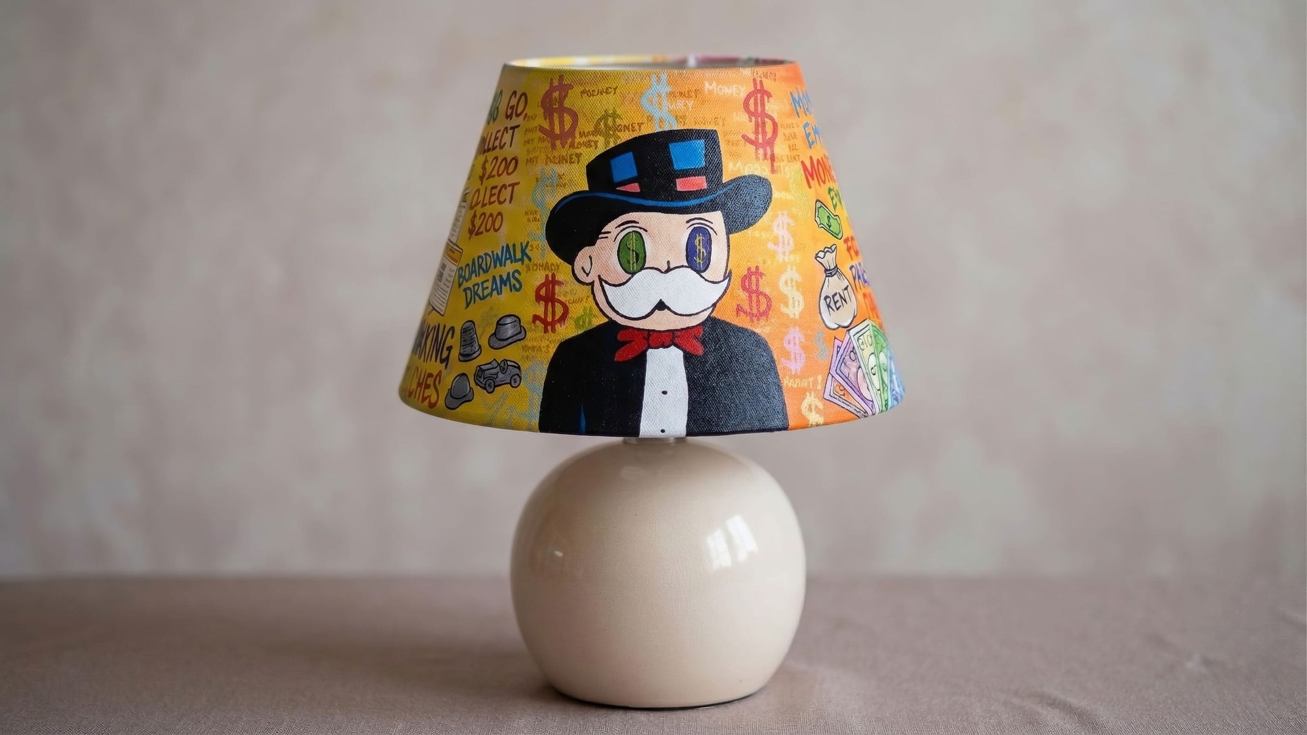 Anahtar Kelimeler: el yapımı abajur, Monopoly Man lamba, Bay Monopoly abajur, graffiti desenli abajur, pop art aydınlatma, dekoratif masa lambası, modern tasarım abajur, sanatsal aydınlatma, renkli abajur şapkası, para temalı dekorasyon, tasarım abajur, fırça darbeli el boyaması lamba, zenginlik konseptli dekor, Boardwalk Dreams lamba.