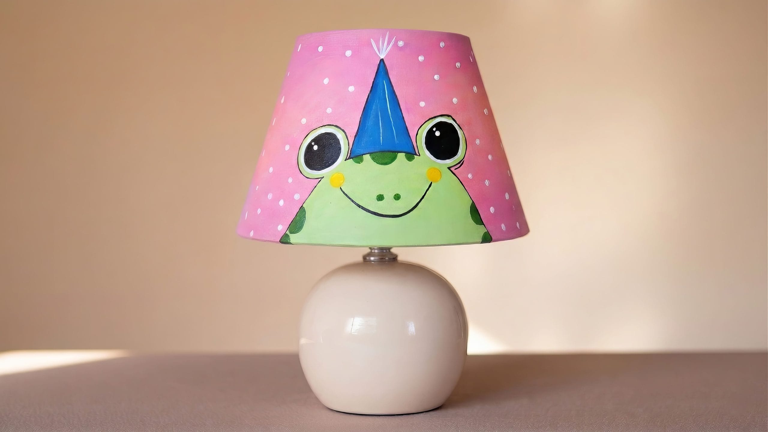 Canlı pembe arka plan üzerindeki beyaz puantiyeler, kurbağanın masum bakışları ve ikonik parti şapkasıyla birleşerek, evinizde adeta bir kutlama havası estiriyor. Yeşilin en tatlı tonları ve el yapımı fırça darbelerinin sıcaklığı, görsel bir şölen sunuyor. Işık yandığında, kurbağanın sevimli yüzü ve soft renk geçişleri, mekanınıza samimi, huzurlu ve karakter dolu bir sıcaklık katar.