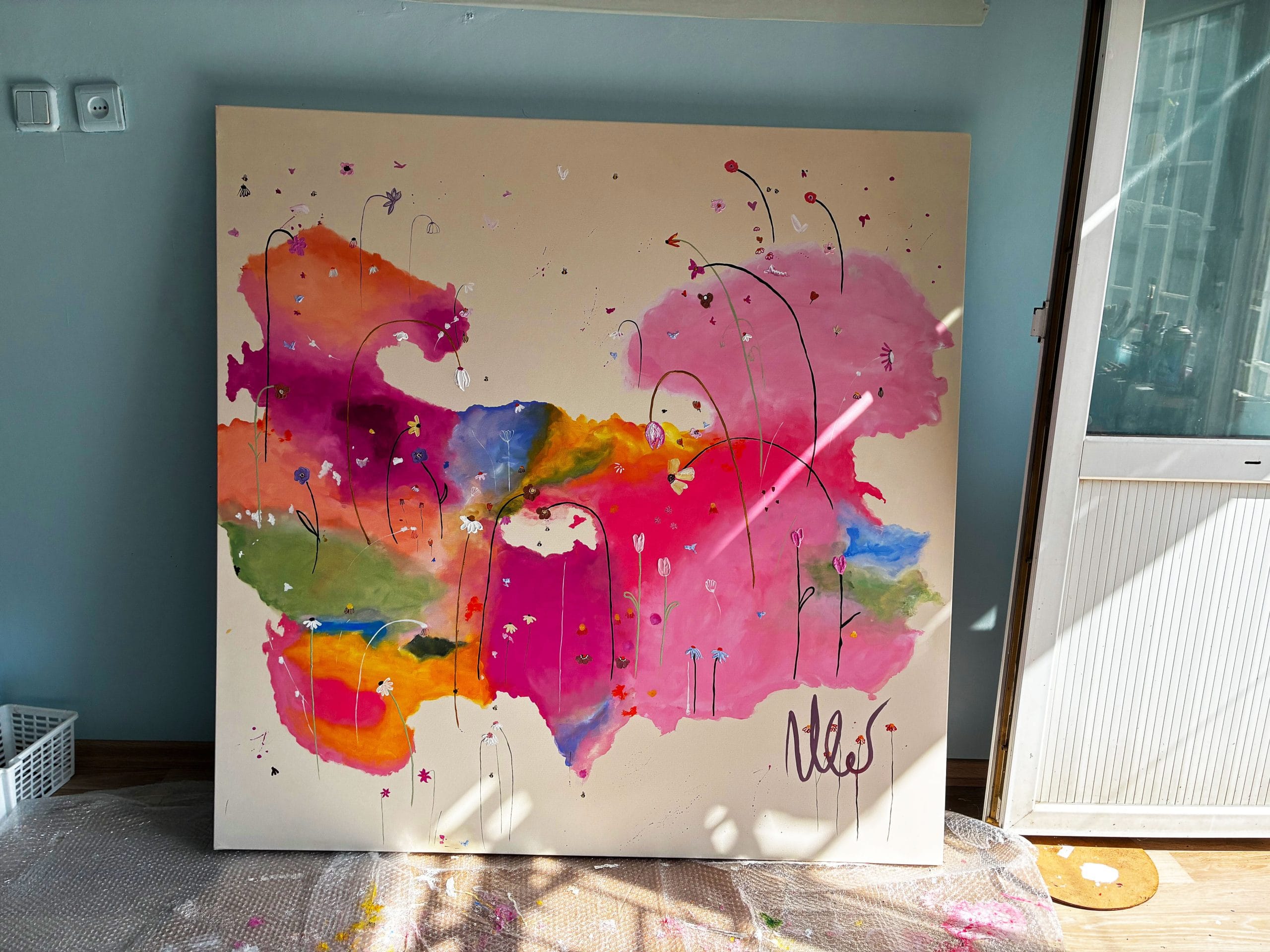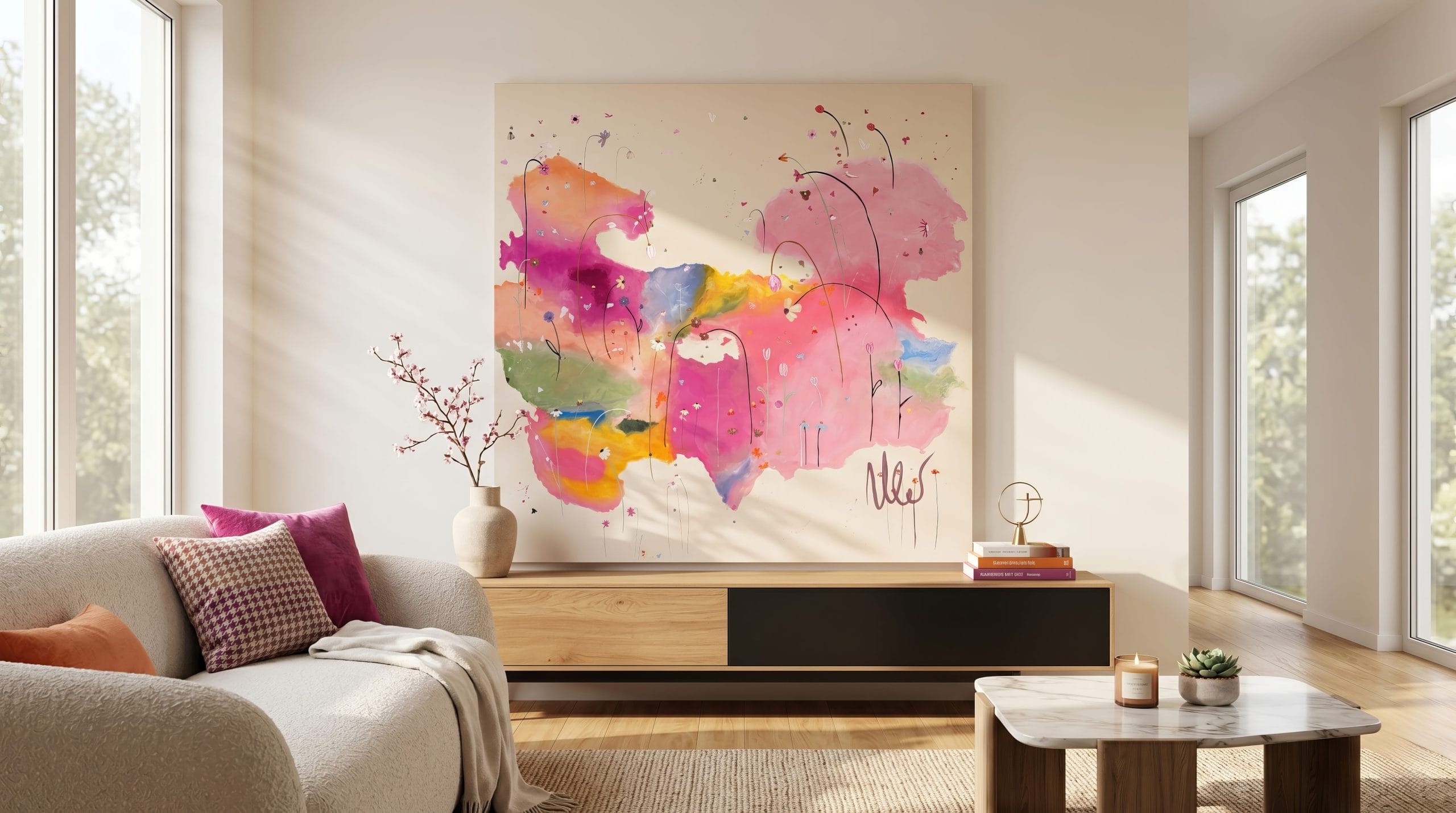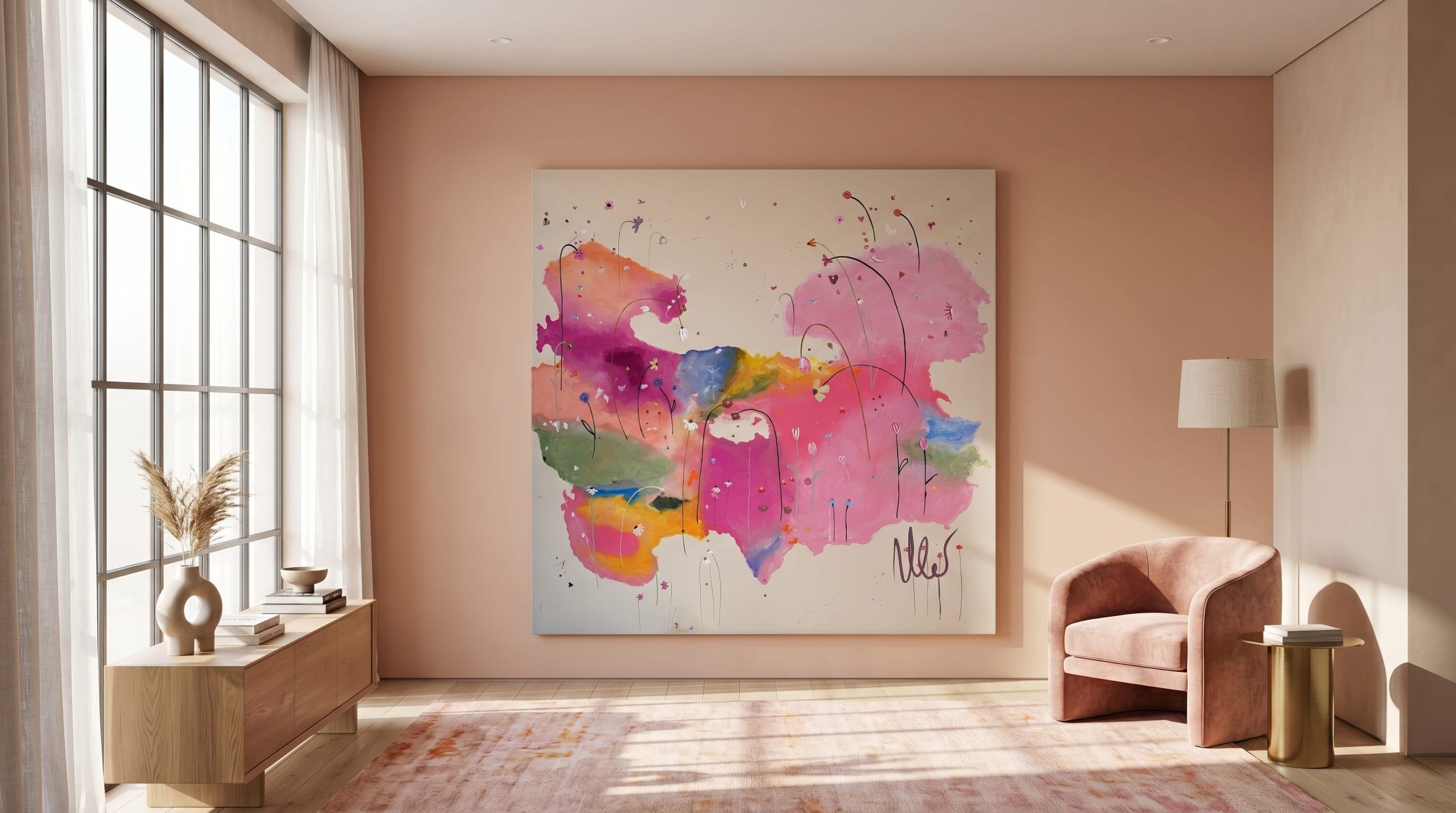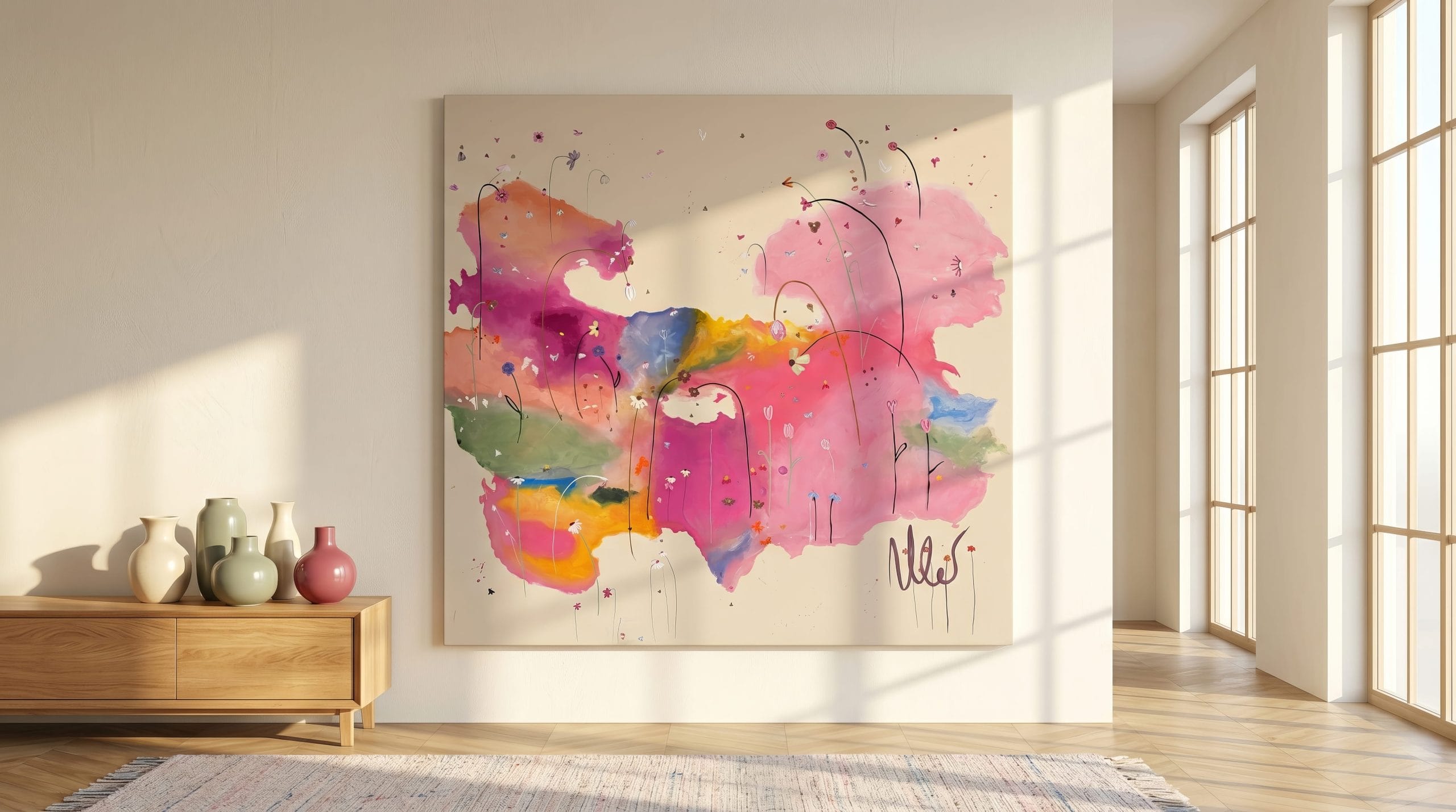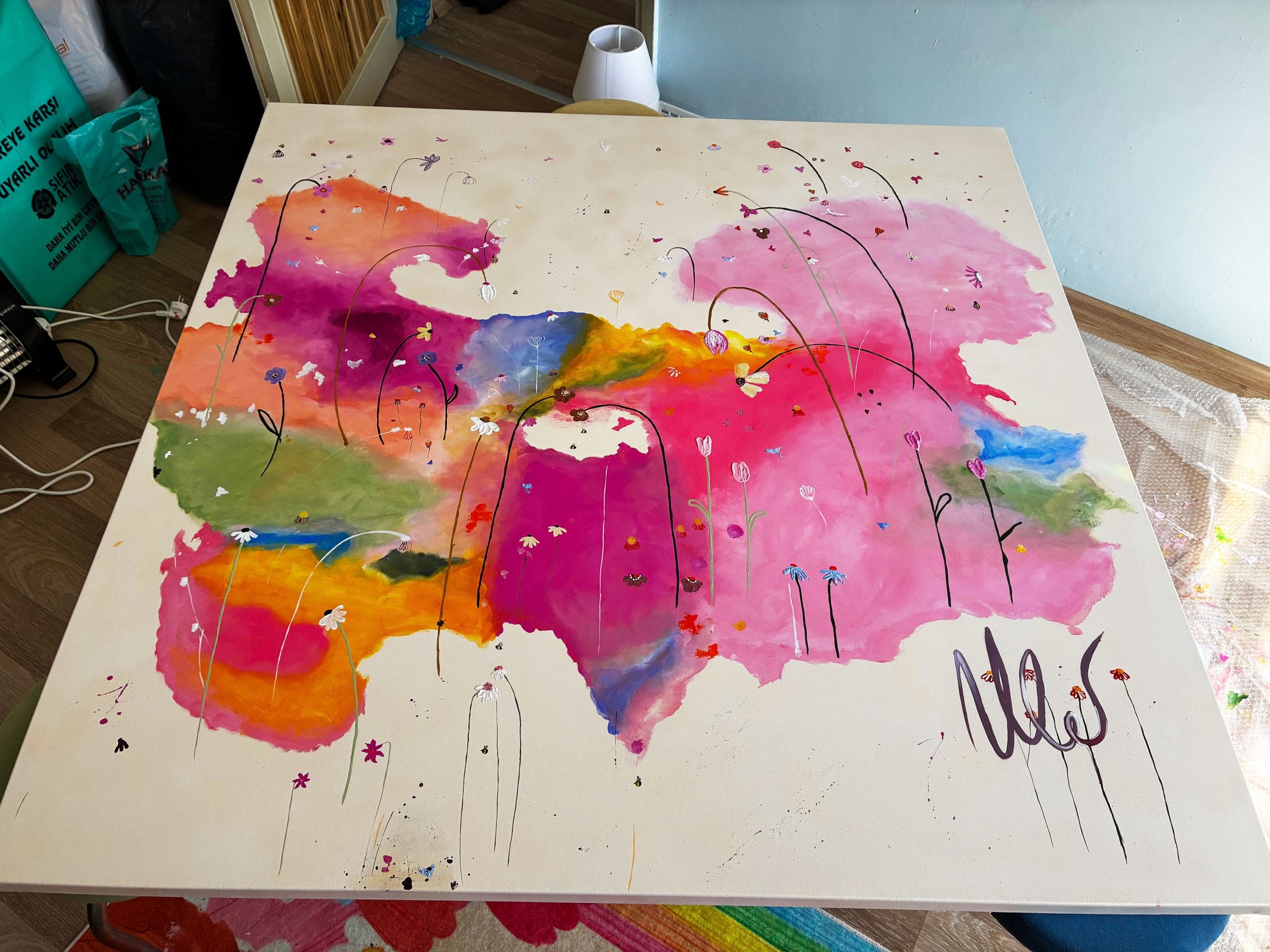 Merkezdeki baskın fuşya ve pembe tonları, yaşam alanlarına dinamizm katarken; turuncu, mavi ve yeşilin cesur darbeleri bu katmanlı doku üzerinde ışık oyunları yaratır. Alçı ve tutkalın verdiği sağlamlık ve belirgin doku, tuval üzerine işlenen ince siyah detaylar ve zarif dal formlarıyla birleşerek, doğanın organik ritmini elinizle hissedebileceğiniz bir formda sunuyor. Kare formu sayesinde mekanda kusursuz bir denge oluşturan bu eser, hem göze hem de dokunma duyusuna hitap eden gerçek bir sanat objesidir.
