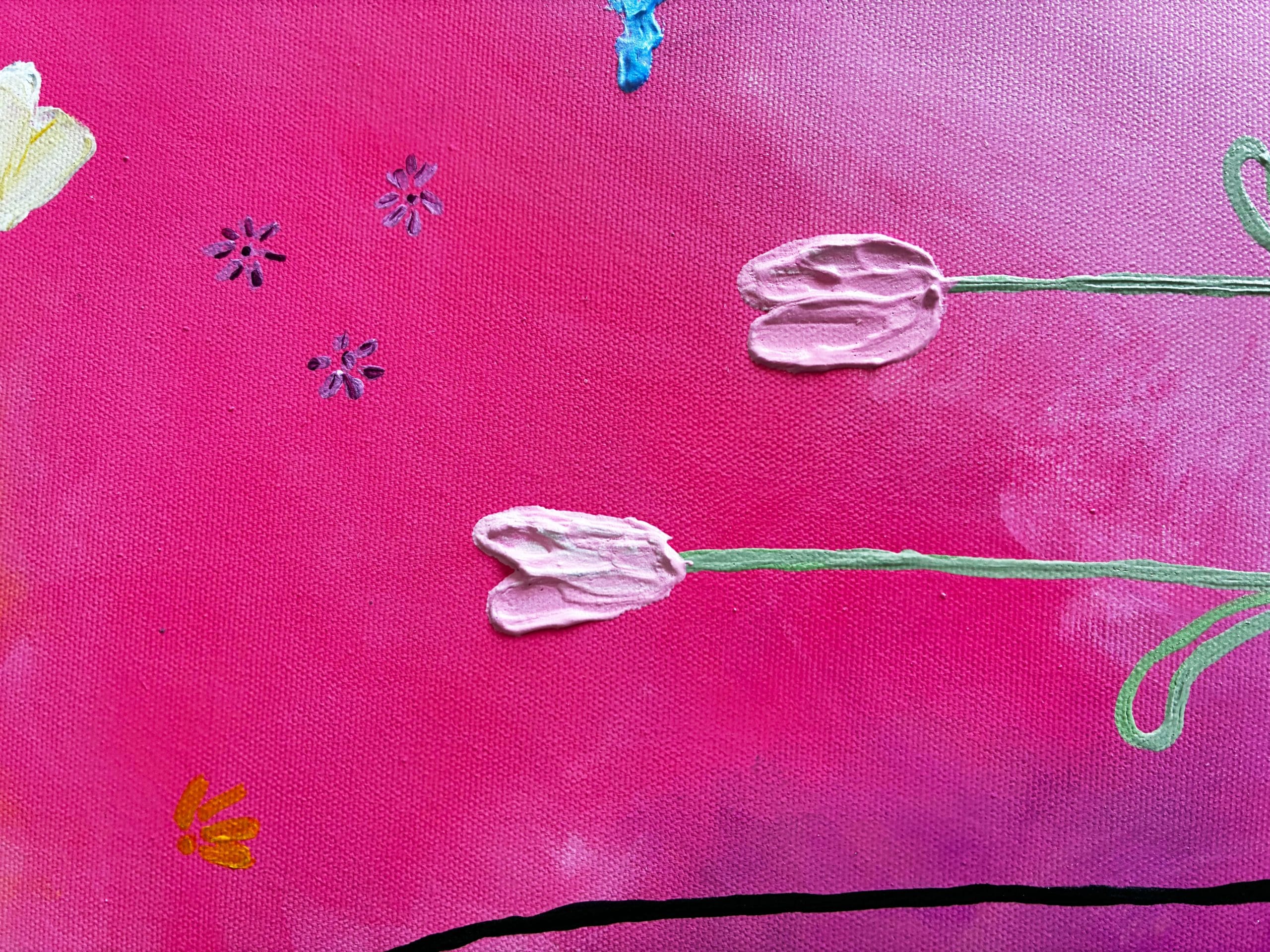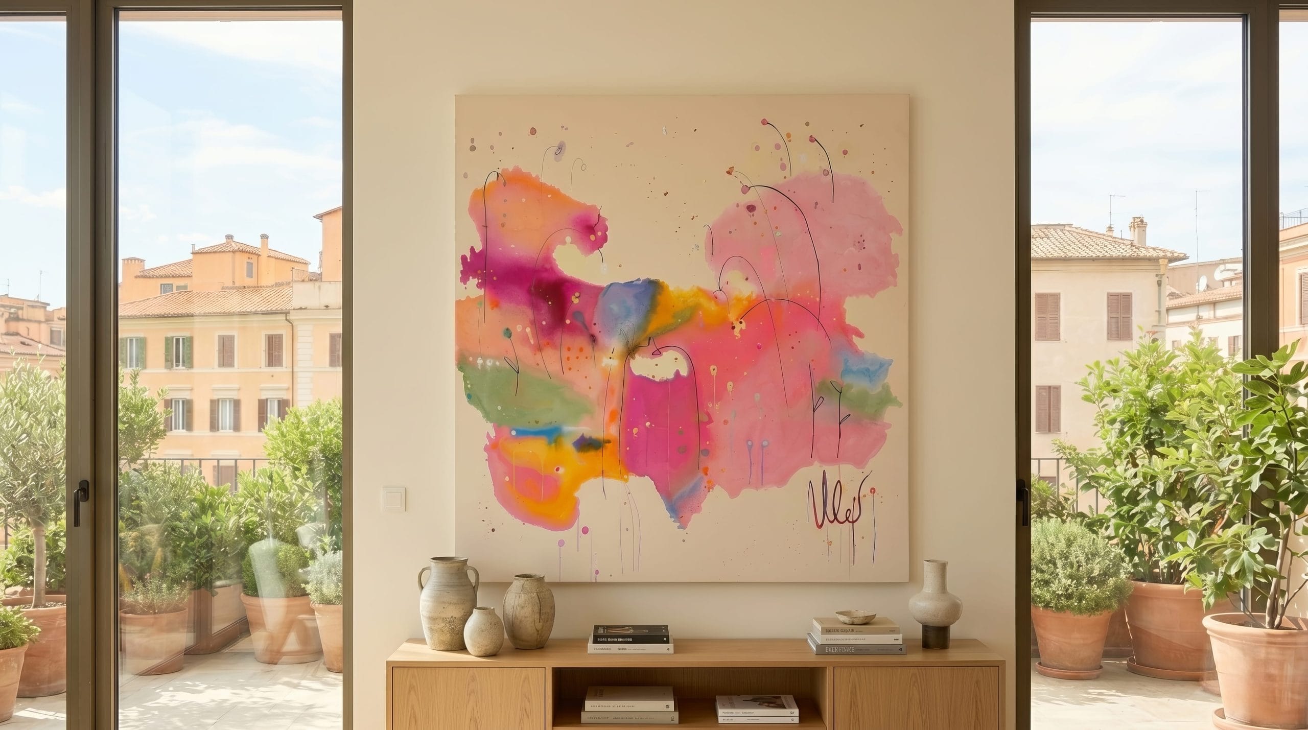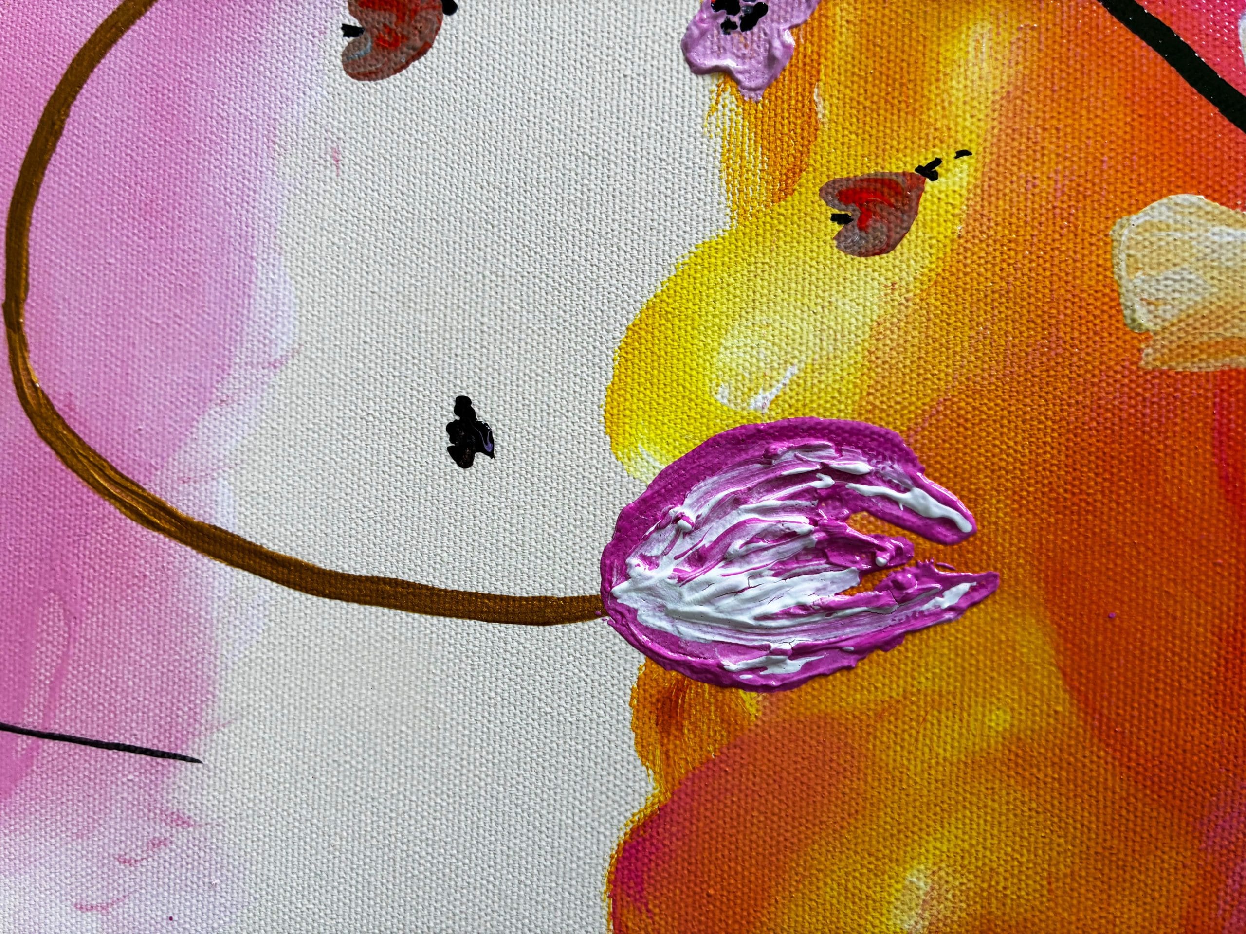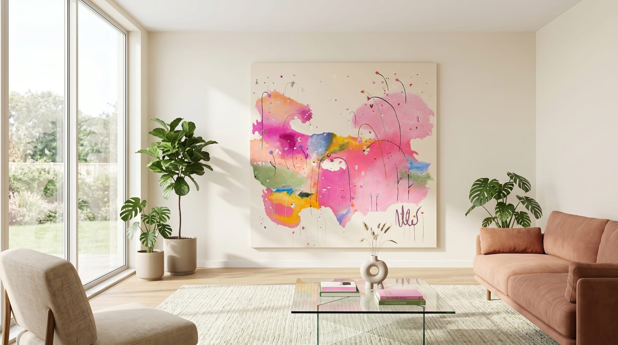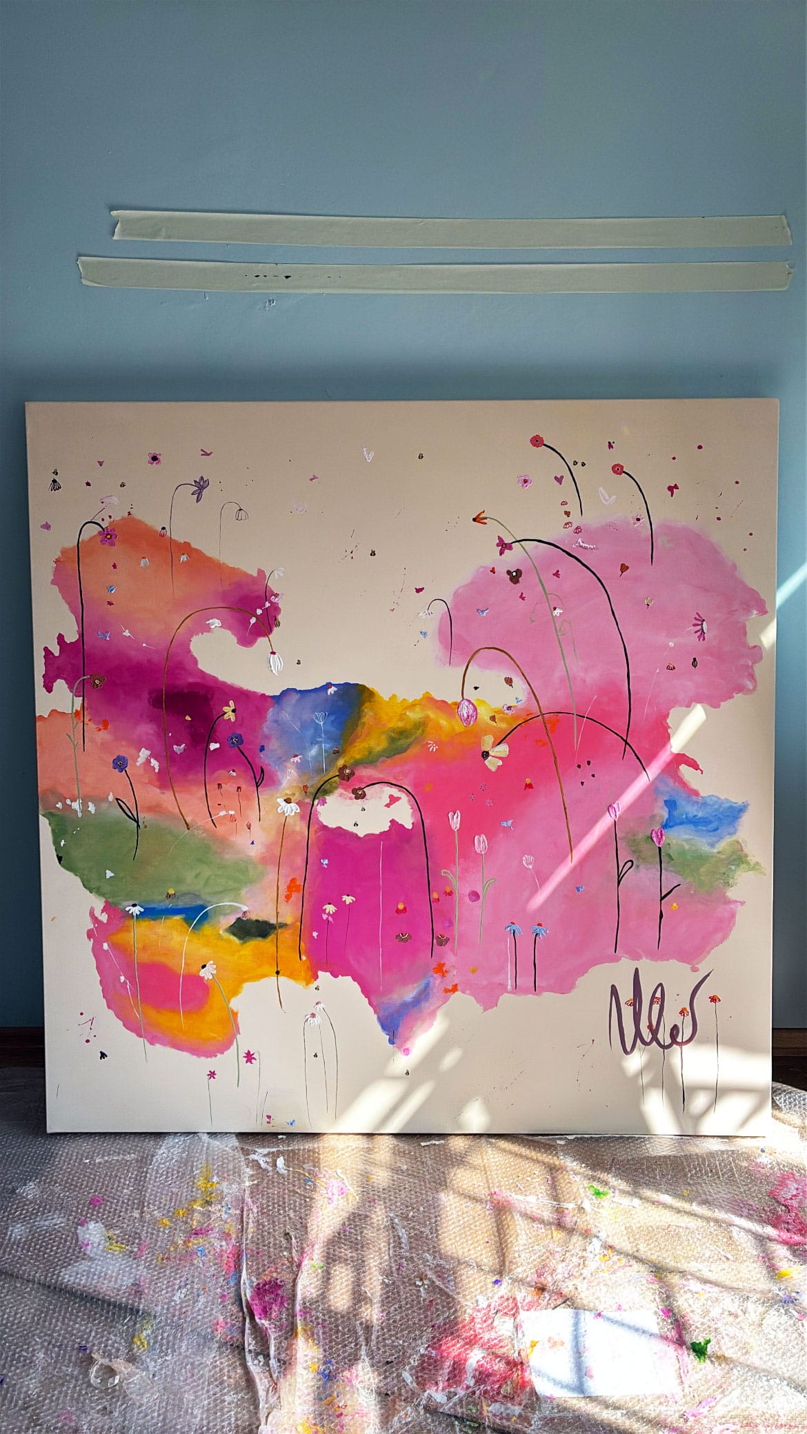 Merkezdeki baskın fuşya ve pembe tonları, yaşam alanlarına dinamizm katarken; turuncu, mavi ve yeşilin cesur darbeleri bu katmanlı doku üzerinde ışık oyunları yaratır. Alçı ve tutkalın verdiği sağlamlık ve belirgin doku, tuval üzerine işlenen ince siyah detaylar ve zarif dal formlarıyla birleşerek, doğanın organik ritmini elinizle hissedebileceğiniz bir formda sunuyor. Kare formu sayesinde mekanda kusursuz bir denge oluşturan bu eser, hem göze hem de dokunma duyusuna hitap eden gerçek bir sanat objesidir.