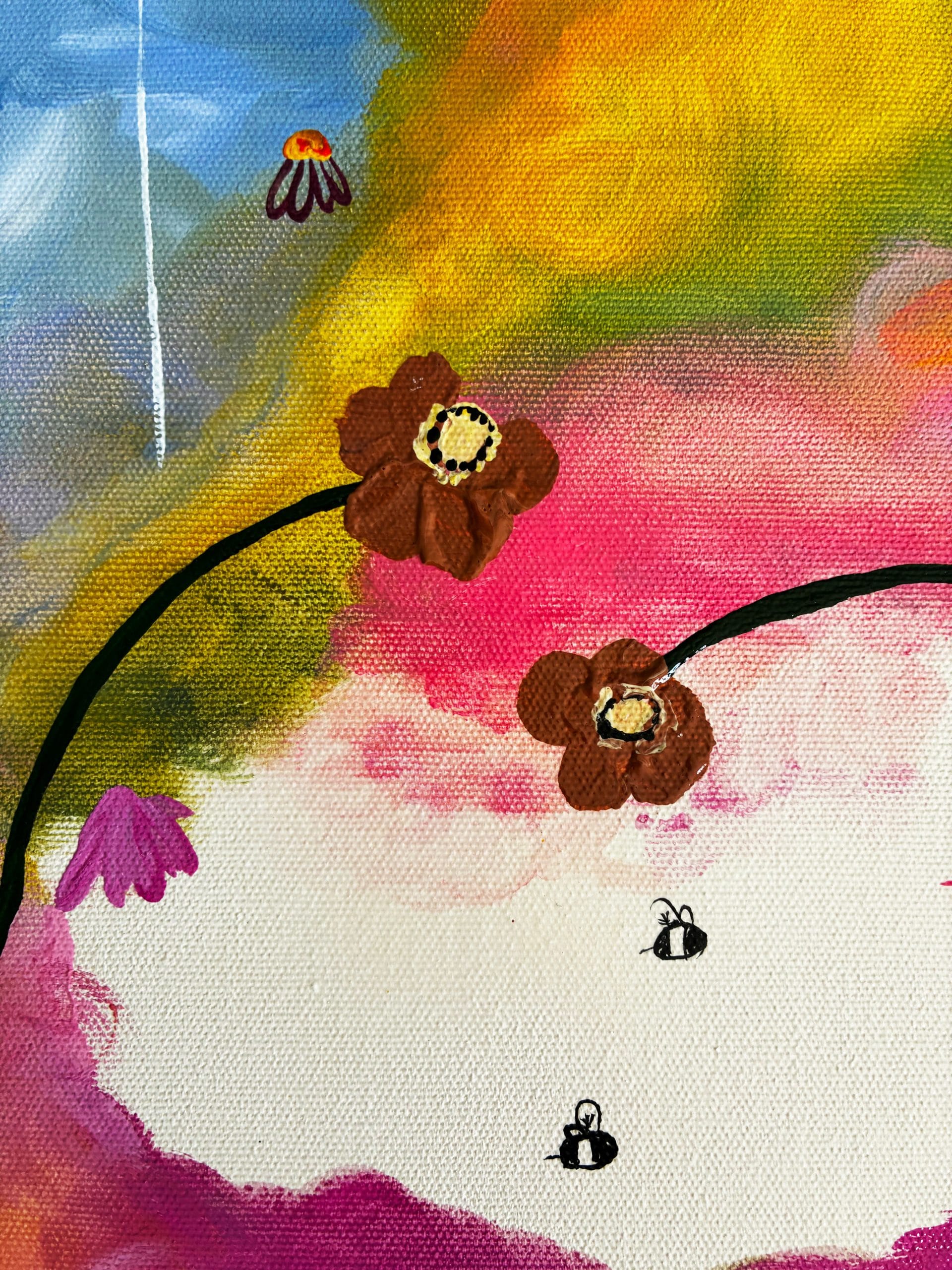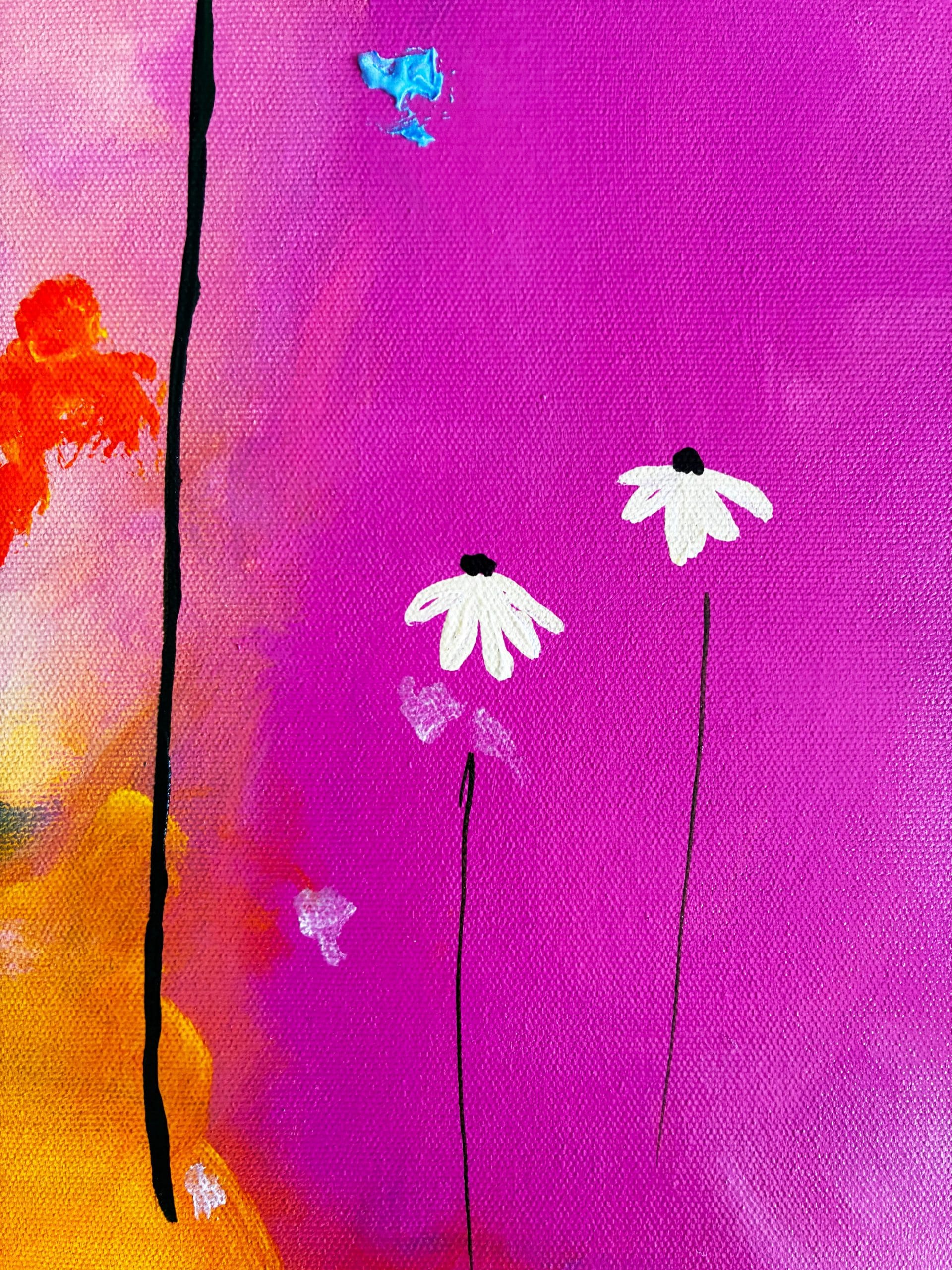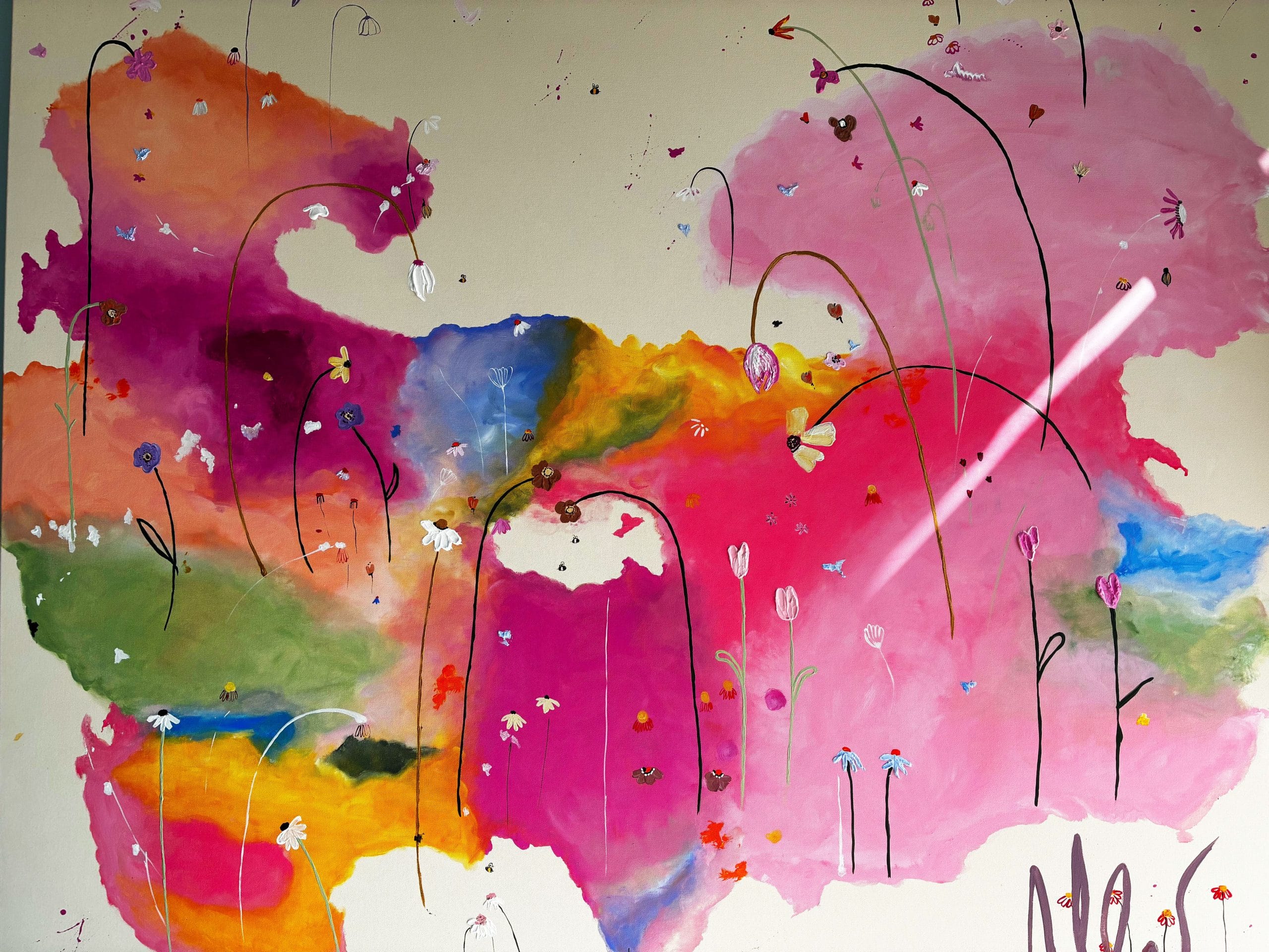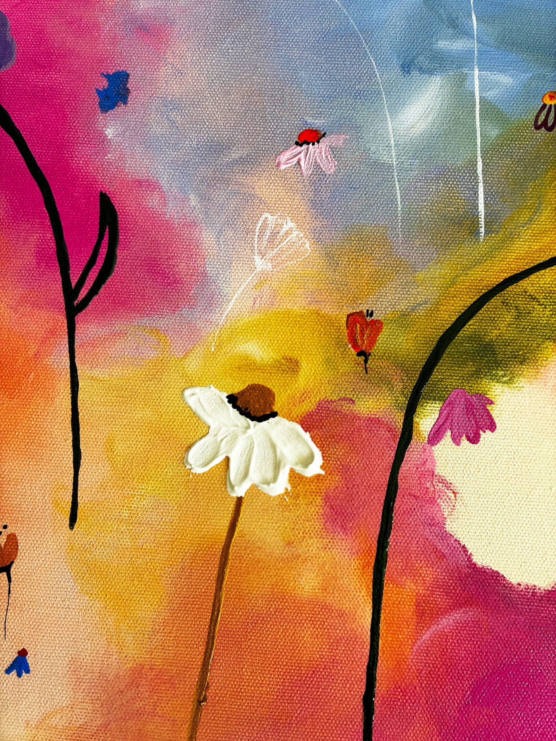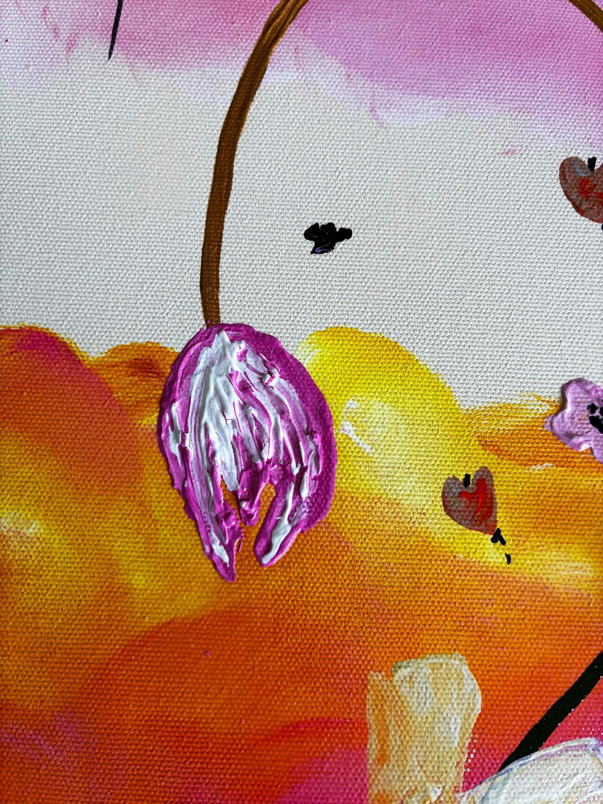 Merkezdeki baskın fuşya ve pembe tonları, yaşam alanlarına dinamizm katarken; turuncu, mavi ve yeşilin cesur darbeleri bu katmanlı doku üzerinde ışık oyunları yaratır. Alçı ve tutkalın verdiği sağlamlık ve belirgin doku, tuval üzerine işlenen ince siyah detaylar ve zarif dal formlarıyla birleşerek, doğanın organik ritmini elinizle hissedebileceğiniz bir formda sunuyor. Kare formu sayesinde mekanda kusursuz bir denge oluşturan bu eser, hem göze hem de dokunma duyusuna hitap eden gerçek bir sanat objesidir.