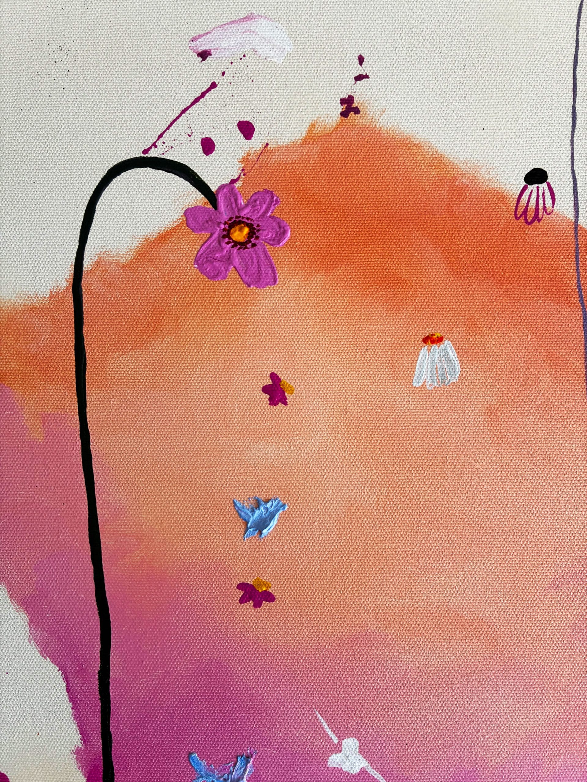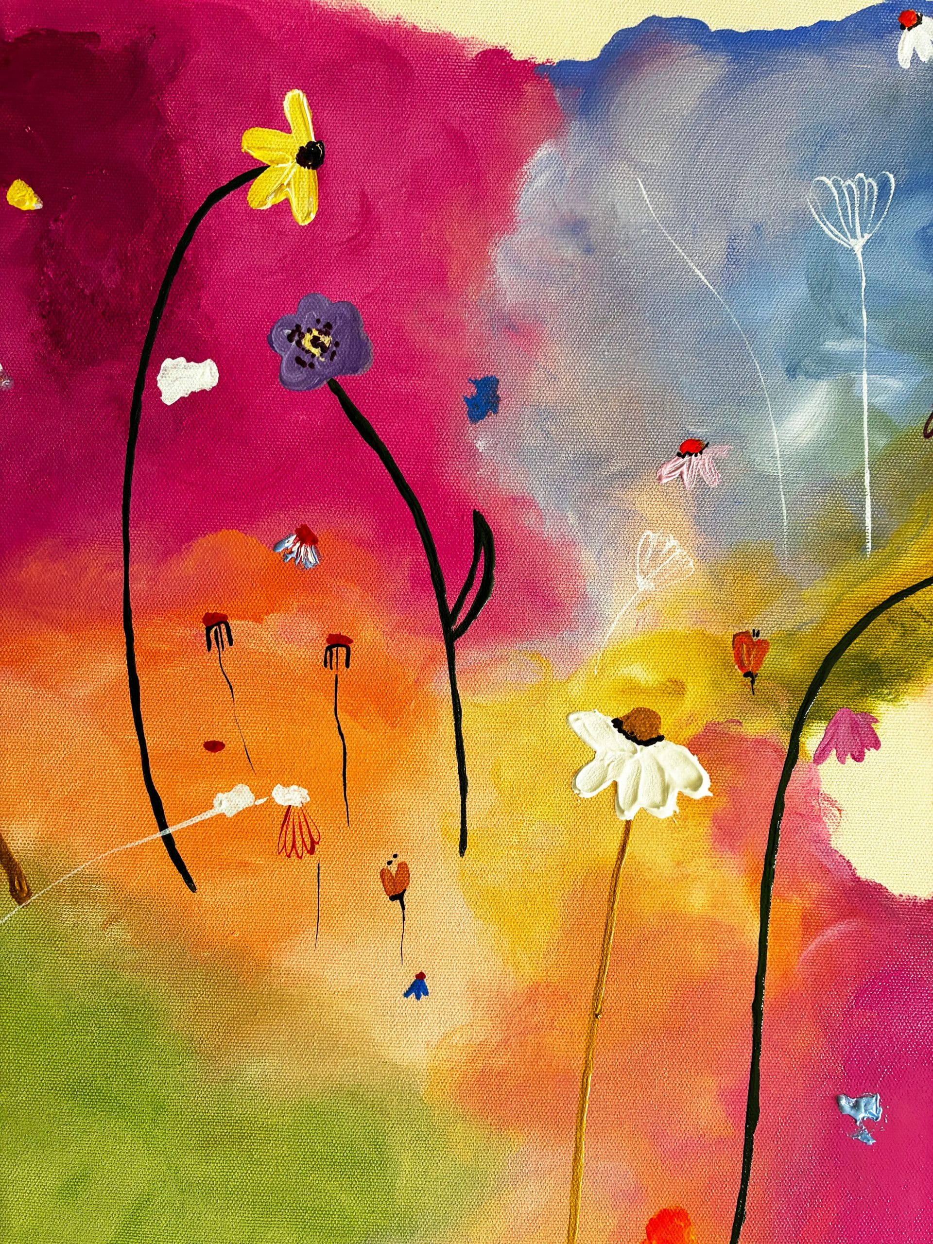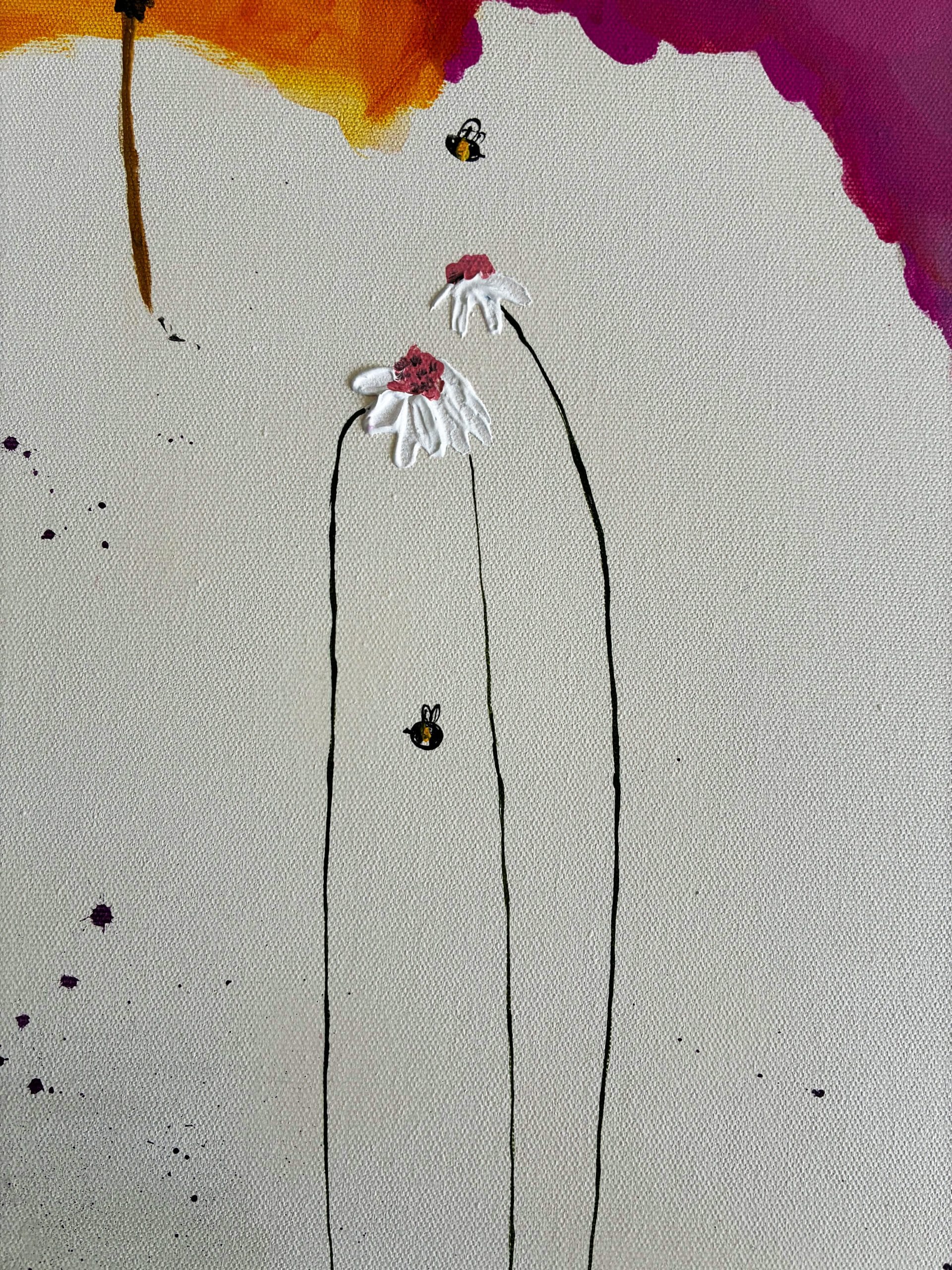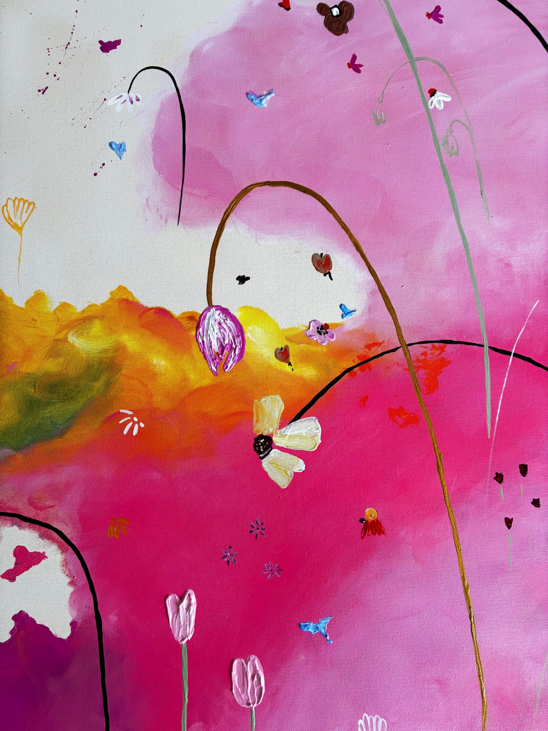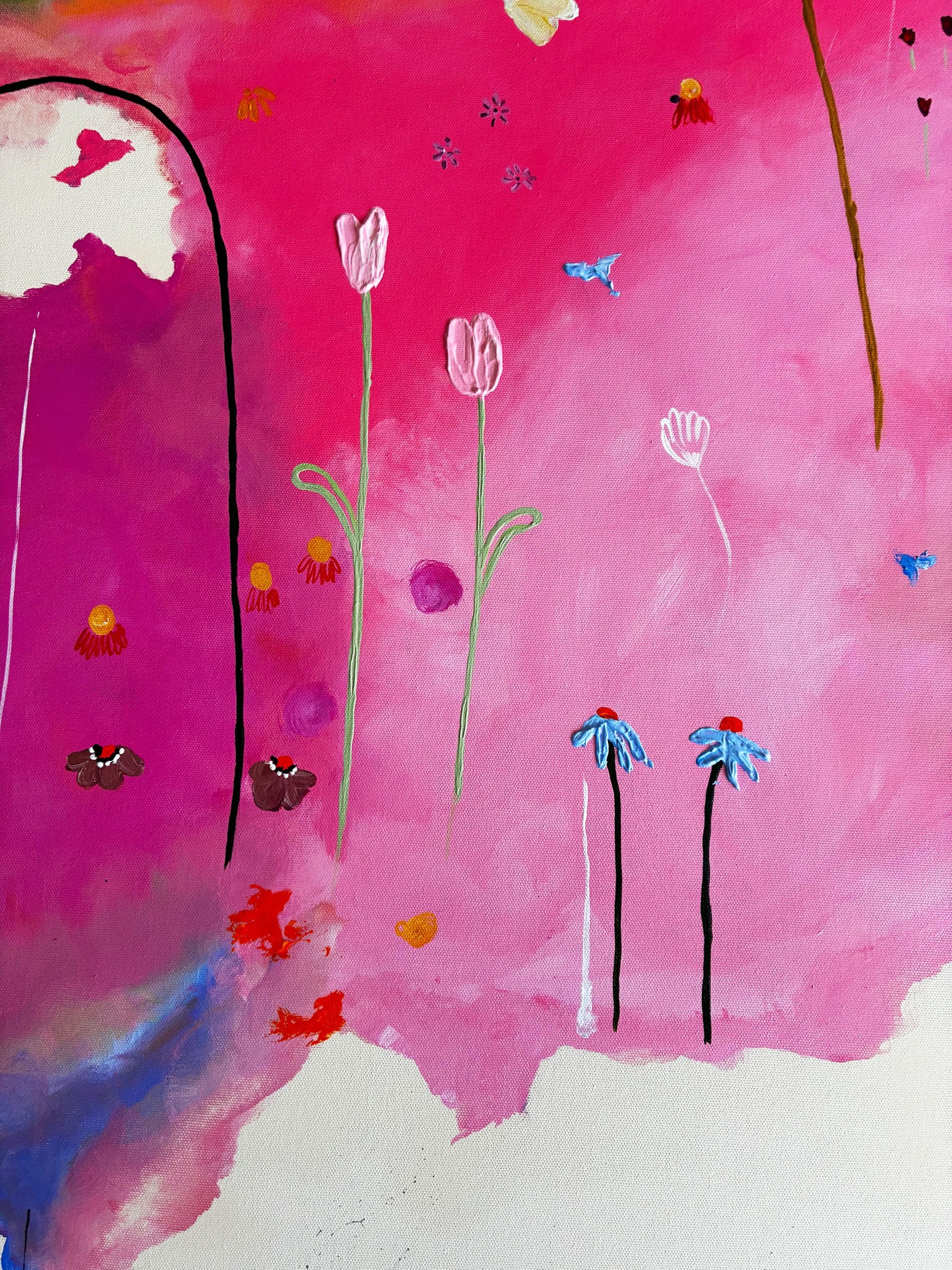 Merkezdeki baskın fuşya ve pembe tonları, yaşam alanlarına dinamizm katarken; turuncu, mavi ve yeşilin cesur darbeleri bu katmanlı doku üzerinde ışık oyunları yaratır. Alçı ve tutkalın verdiği sağlamlık ve belirgin doku, tuval üzerine işlenen ince siyah detaylar ve zarif dal formlarıyla birleşerek, doğanın organik ritmini elinizle hissedebileceğiniz bir formda sunuyor. Kare formu sayesinde mekanda kusursuz bir denge oluşturan bu eser, hem göze hem de dokunma duyusuna hitap eden gerçek bir sanat objesidir.