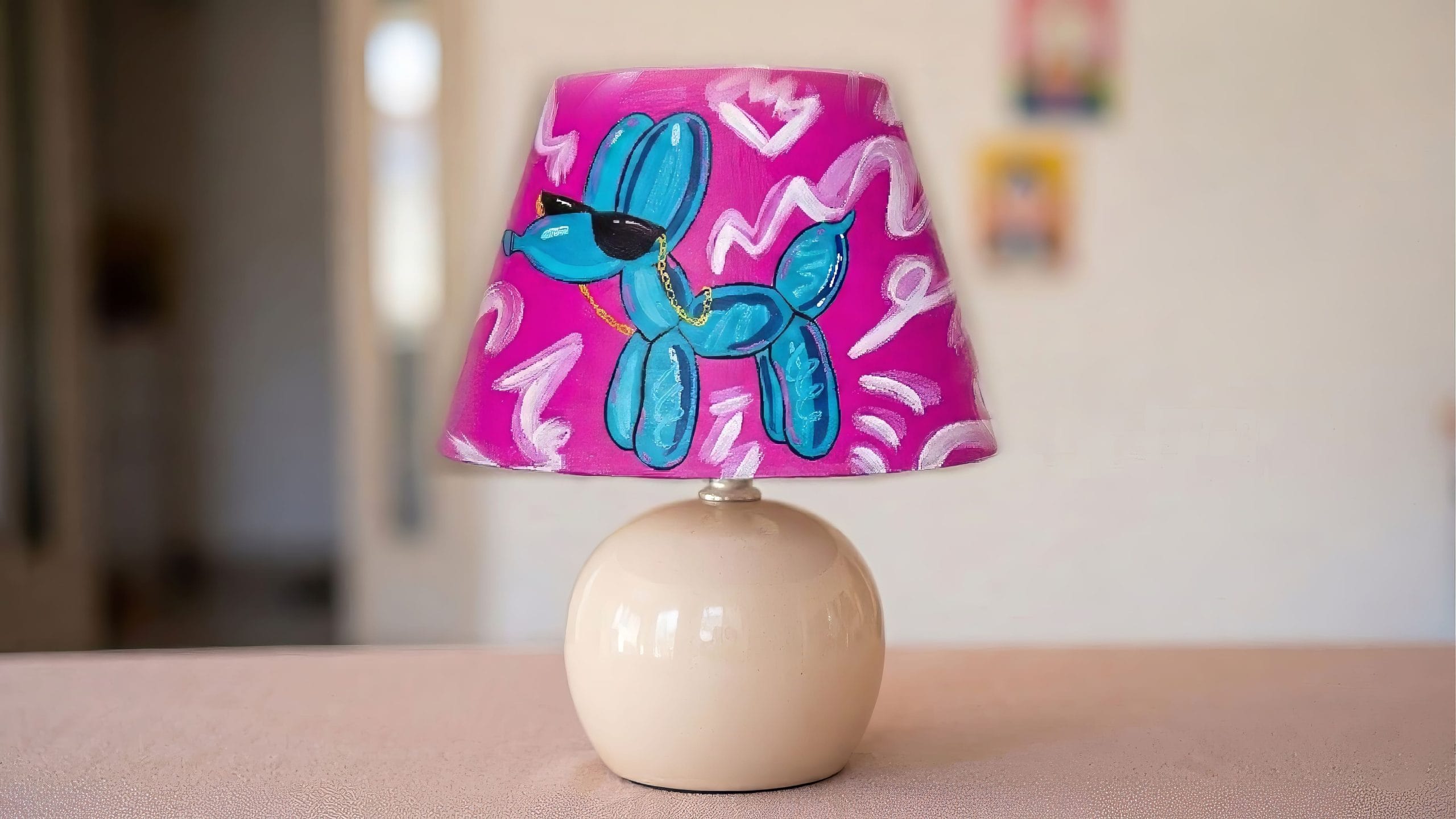 Anahtar Kelimeler: pop art abajur, el yapımı balon köpek lamba, balloon dog abajur, jeff koons esintili lamba, graffiti desenli abajur, modern pop art aydınlatma, dekoratif masa lambası, modern tasarım abajur, sanatsal aydınlatma, pembe pop art şapka, iç mekân sanat objesi, tasarım lamba.