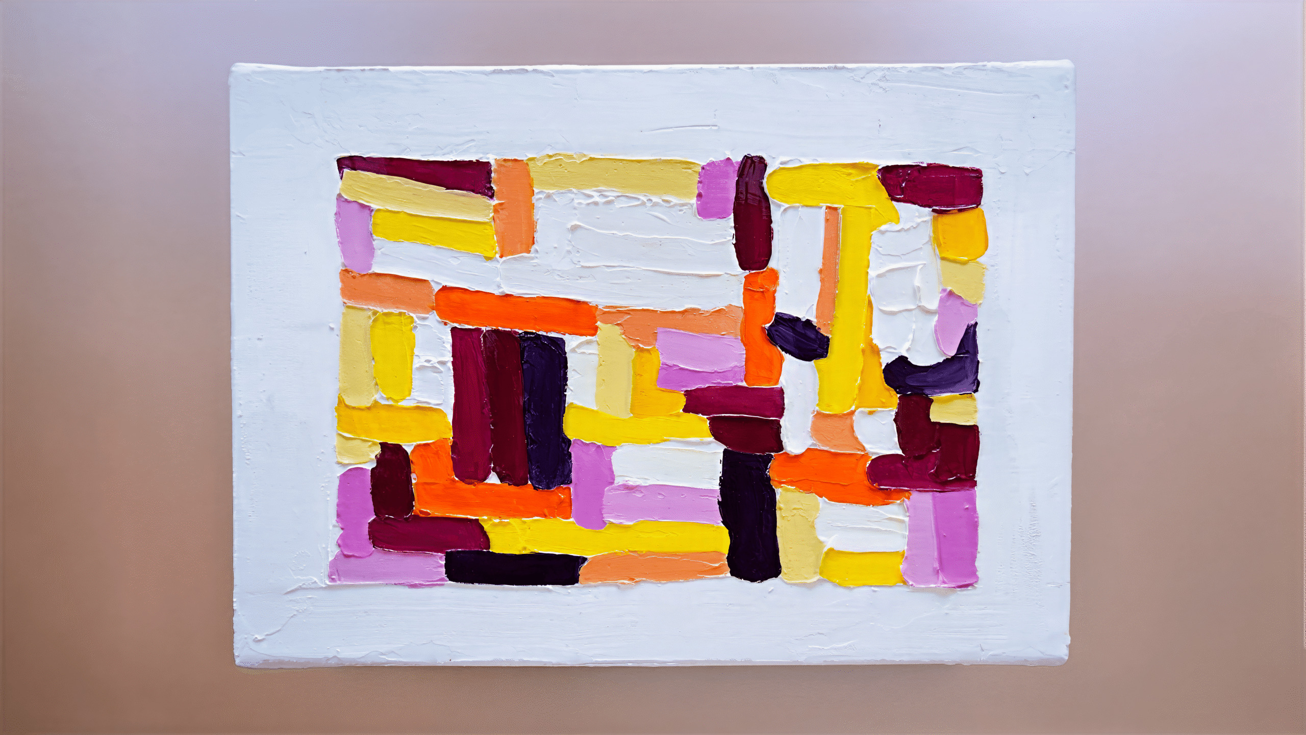 Abstract Harmony, renklerin iç içe geçtiği bir düzende denge arayışını temsil eden, cesur ve sıcak tonlardan oluşan dokulu bir soyut akrilik tablodur. Sarıdan bordo ve mora, turuncudan pembeye uzanan renk blokları, beyaz zemin üzerinde birbirine kenetlenmiş gibi duran formlar oluşturur. Her bir fırça darbesi, hareket hissi ve ritmik bir geçiş duygusu yaratır.