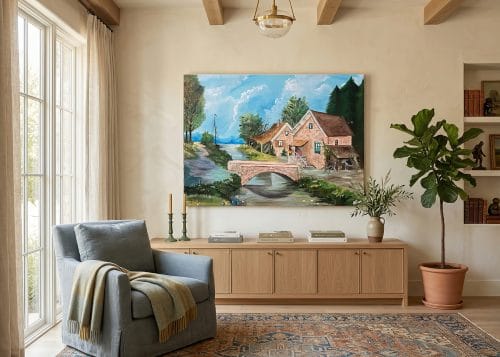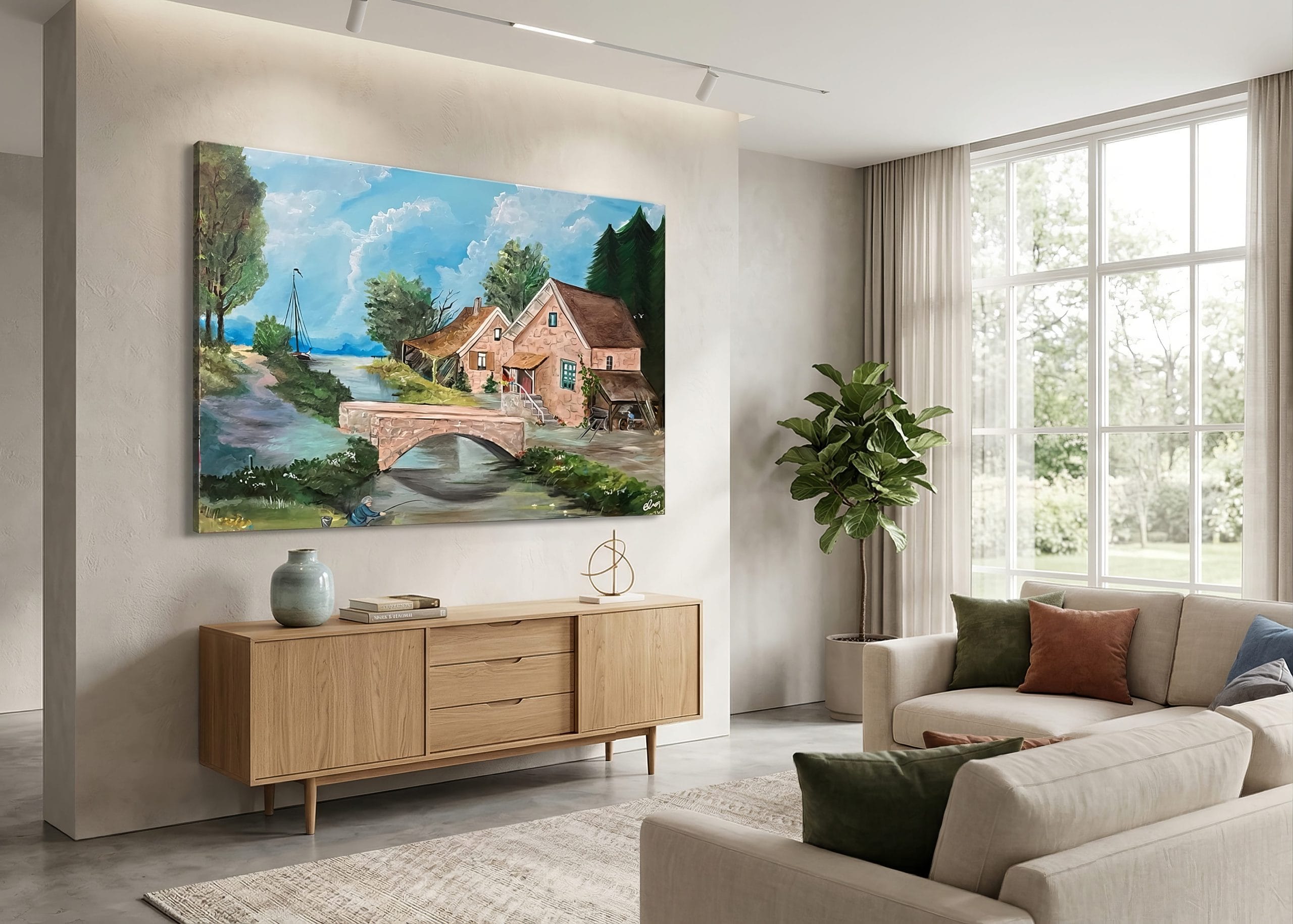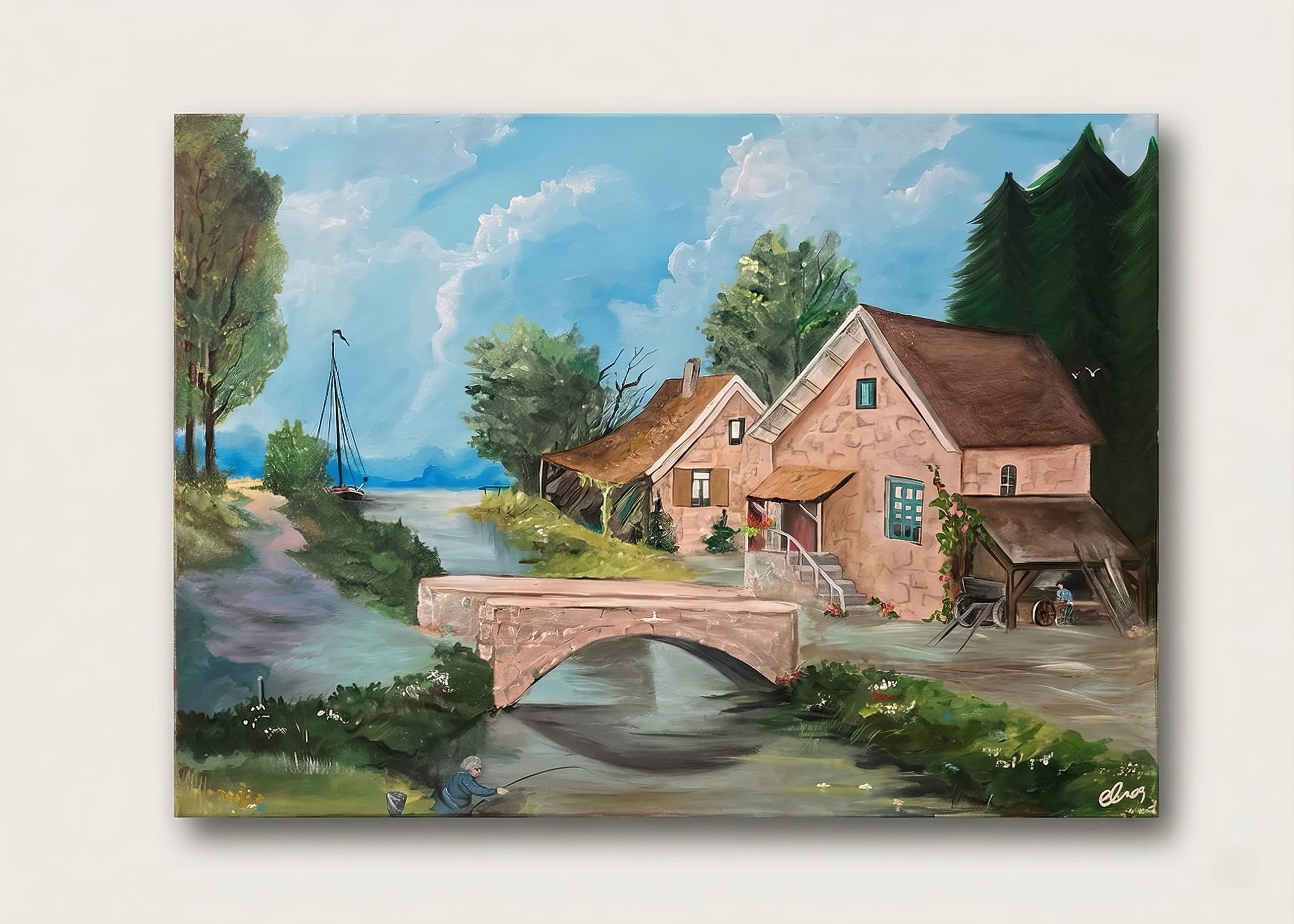 Anahtar Kelimeler: Manzara tablosu, nehir kenarı resmi, impasto manzara sanatı, dokulu taş ev tablosu, modern doğa resmi, el yapımı manzara, dekoratif köy manzarası, köprü ve nehir resmi, impasto peyzaj, koleksiyonluk manzara eseri