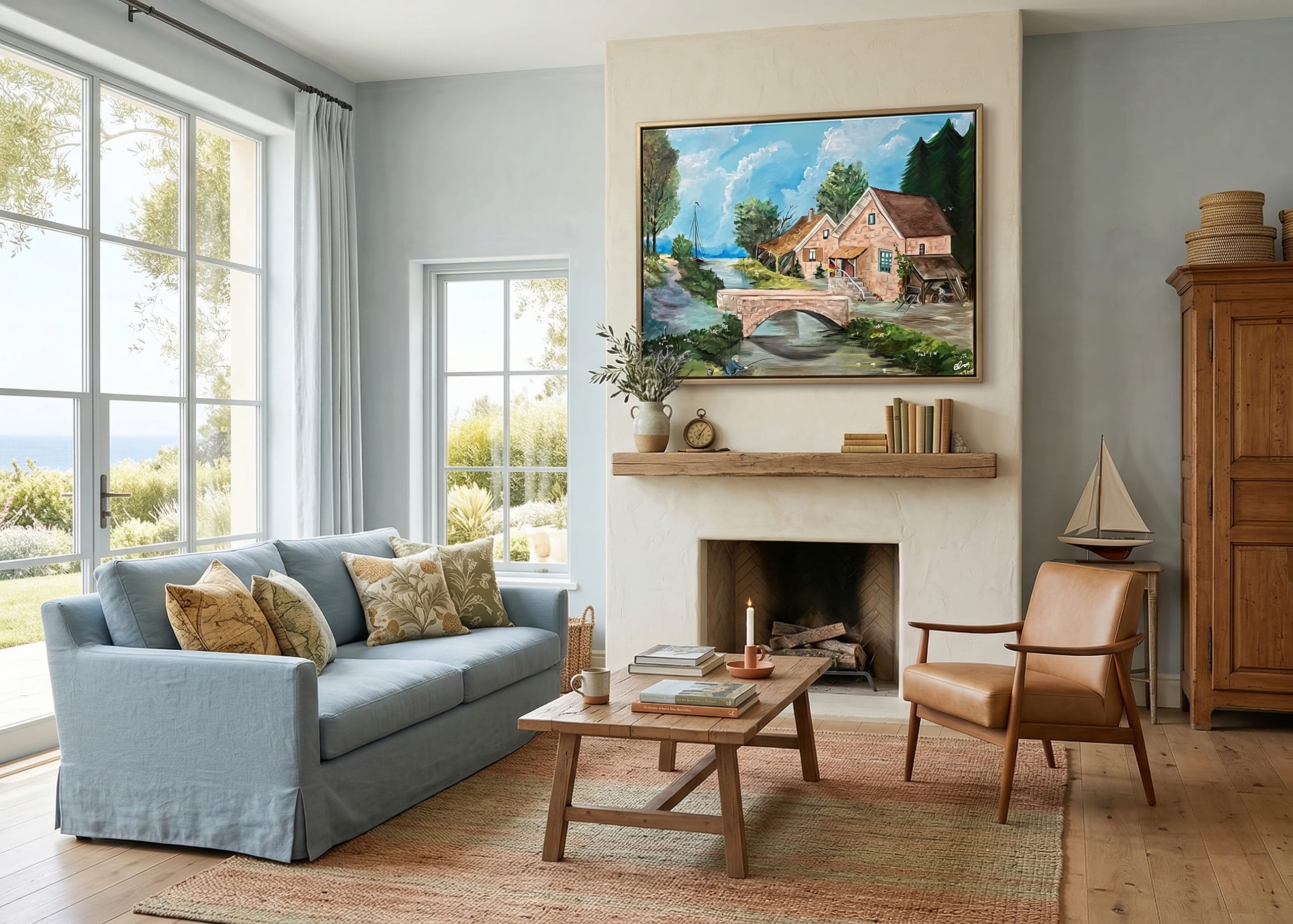 Mavi, yeşil ve toprak tonlarının uyumuyla dinlendirici bir atmosfer.